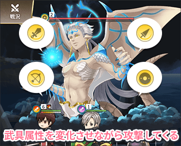 ブランフォーザは行動「神器換装」によって武具属性を変化させながら戦いを進めます。