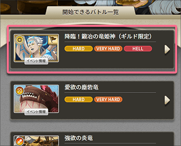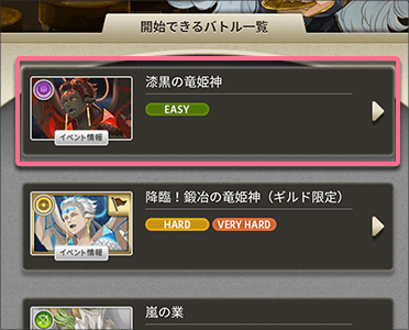 •  「Lv20 竜姫神エボナミネラ」以降のバトルを主催するには「竜姫赫章」が必要になります。アイテムが不足している場合は主催対象のリストに表示されません。